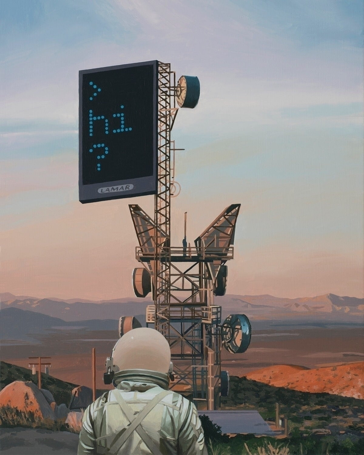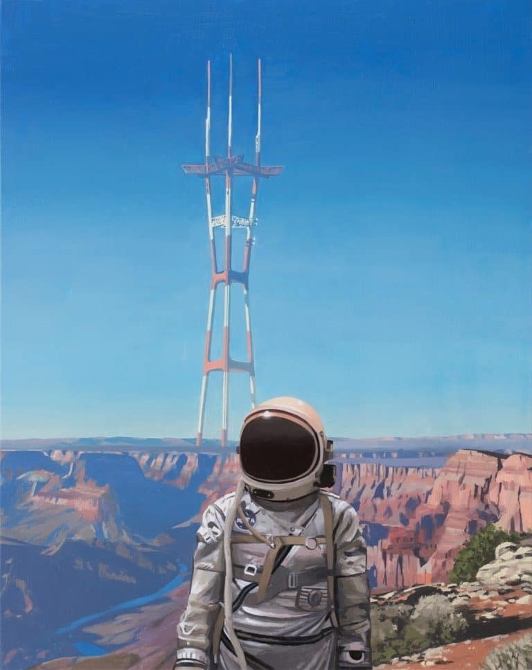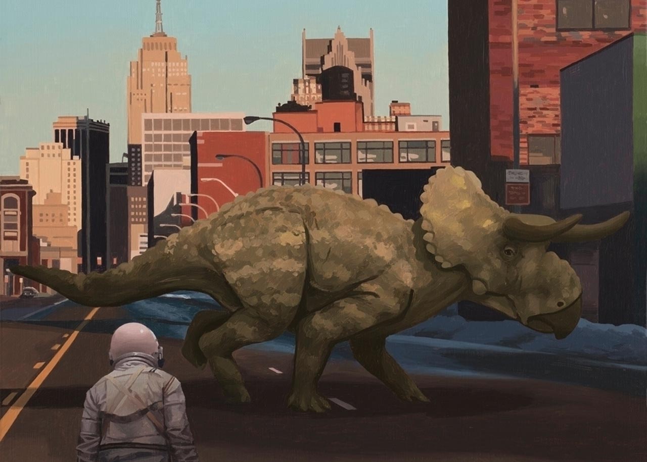 Zijn webstek heet astronaut dinosaur en dat is dan gelijk de meest compacte samenvatting van zijn oeuvre: afbeeldingen van een eenzame astronaut die rondloopt op een post-apocalyptische aarde en af een toe een verdwaalde dino die is vergeten om uit te sterven. Verder zien we veel science fiction verwijzingen naar de rijke westerse cultuur en pop art-achtige invloeden. Enjoy: