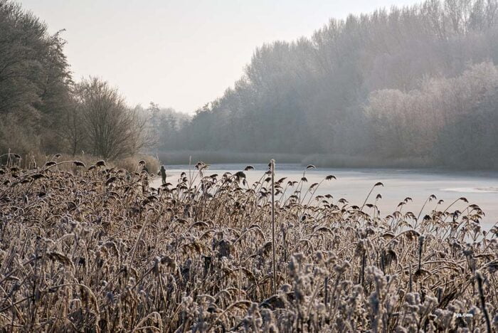 Afgelopen herfst liepen we nog te mekkeren dat er te weinig variatie was om de 4-seizoenentocht spannend te houden. Maar zie, het werd zowaar echt winter. Weliswaar sneeuwde het hier niet, maar de geest van Anton Pieck had ’s nachts alles van een dikke laag rijp voorzien. En koud dat het was: stramme jatten aan de camera, ijs op het brakke water bij de Goudplaat (met schaatsers!) en zelfs het strand was wit.